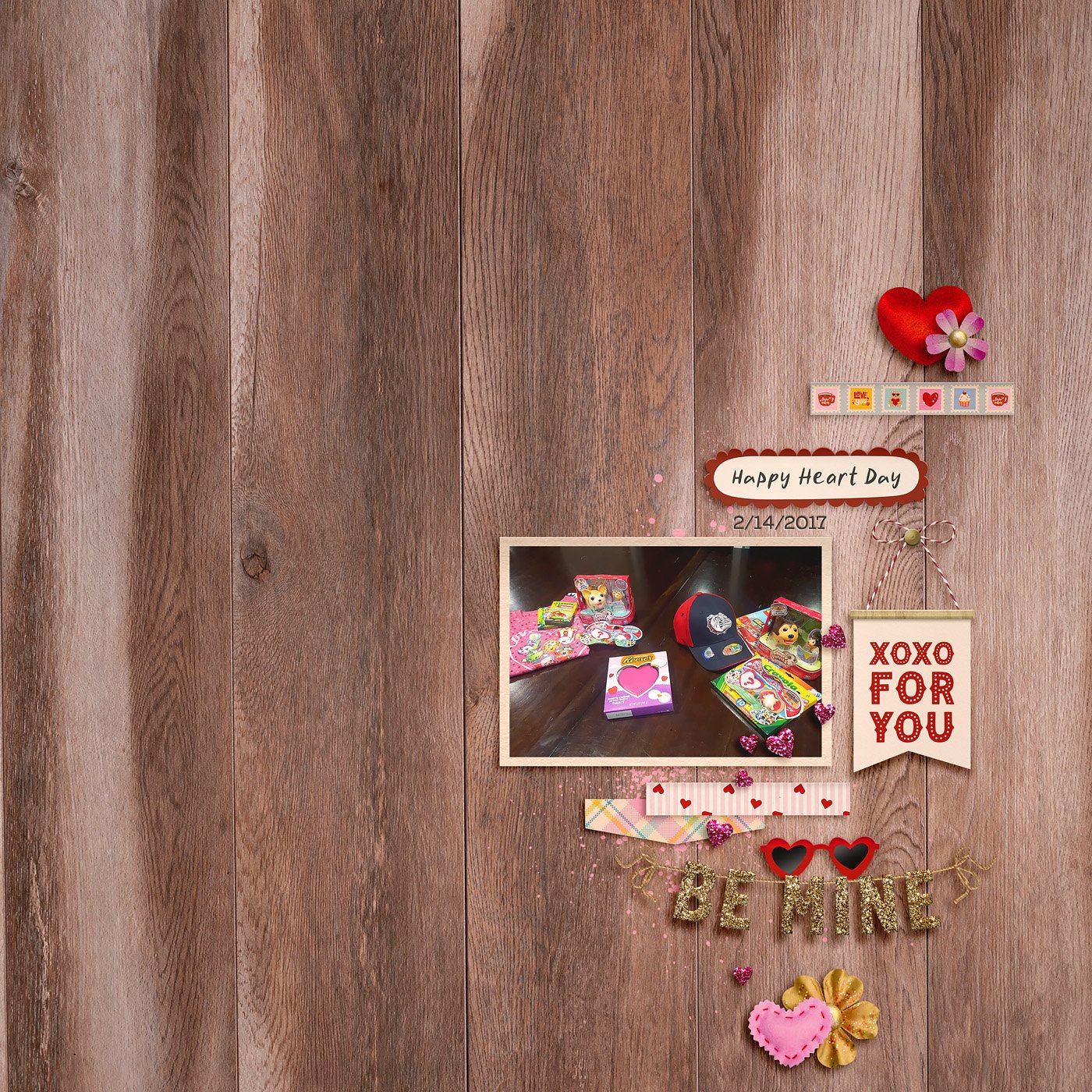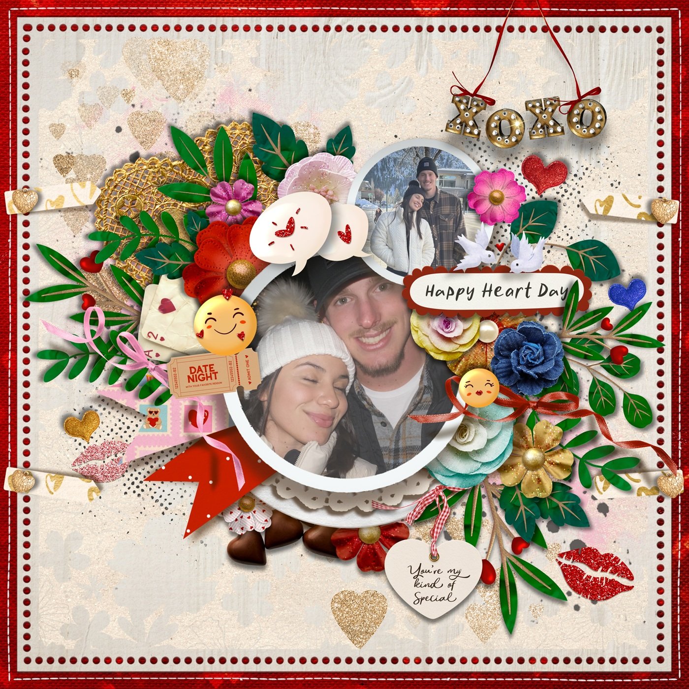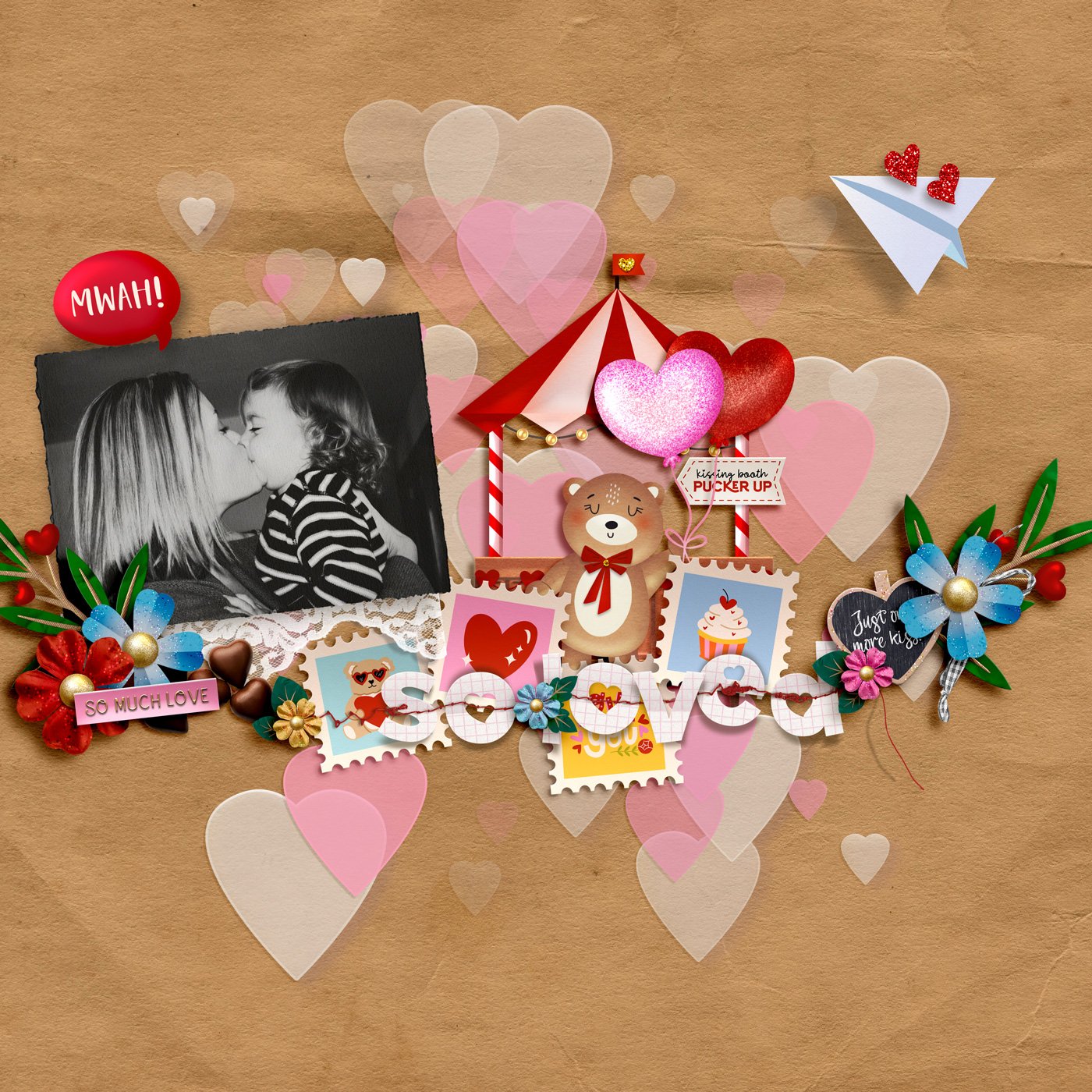 This kit is overflowing with playful, love-filled details inspired by the nostalgic charm of a vintage kissing booth. It features adorable bear illustrations, layered florals, delicate lace, soft ribbons, stitched textures, hearts, labels, banners, word art, and sweet romantic accents that bring warmth and personality to every page. The design blends cheerful retro colors with touches of gold, creating a cozy, whimsical atmosphere full of kisses, hugs, and happy memories — perfect for documenting love stories, special people, joyful moments, and all the little things that make the heart smile.